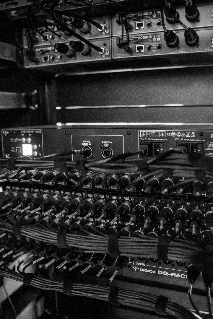 Acoustic improvements were made through the installation of custom wall mounted acoustic treatment, helping reduce reflections and improve speech clarity and musical definition. Infrastructure enhancements included the installation of a new back of house equipment rack, configuration of Netgear AV switches for Dante and lighting networks, integration of the existing production network, and deployment of a Lyntec power sequencing system to manage audio and RF equipment power control.
